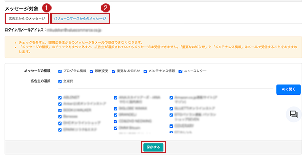 タブ切り替えで「広告主からのメッセージ」「バリューコマースからのメッセージ」の受信可否設定を確認できます。ログイン用メールアドレス宛に配信されるメールについて、受信する場合にはチェックボックスにチェックをつけ、受信しない場合にはチェックをはずし、「保存する」ボタンを押します。