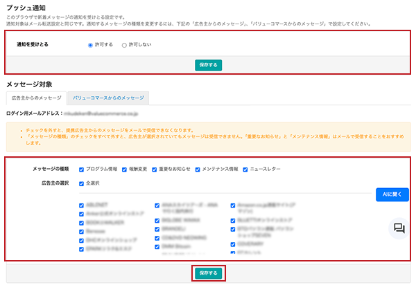 メッセージ対象にて、提携している広告主名が表示されます。メッセージを受信したい広告主のみチェックをつけ、受信しない場合にはチェックをはずし、「保存する」ボタンを押します。