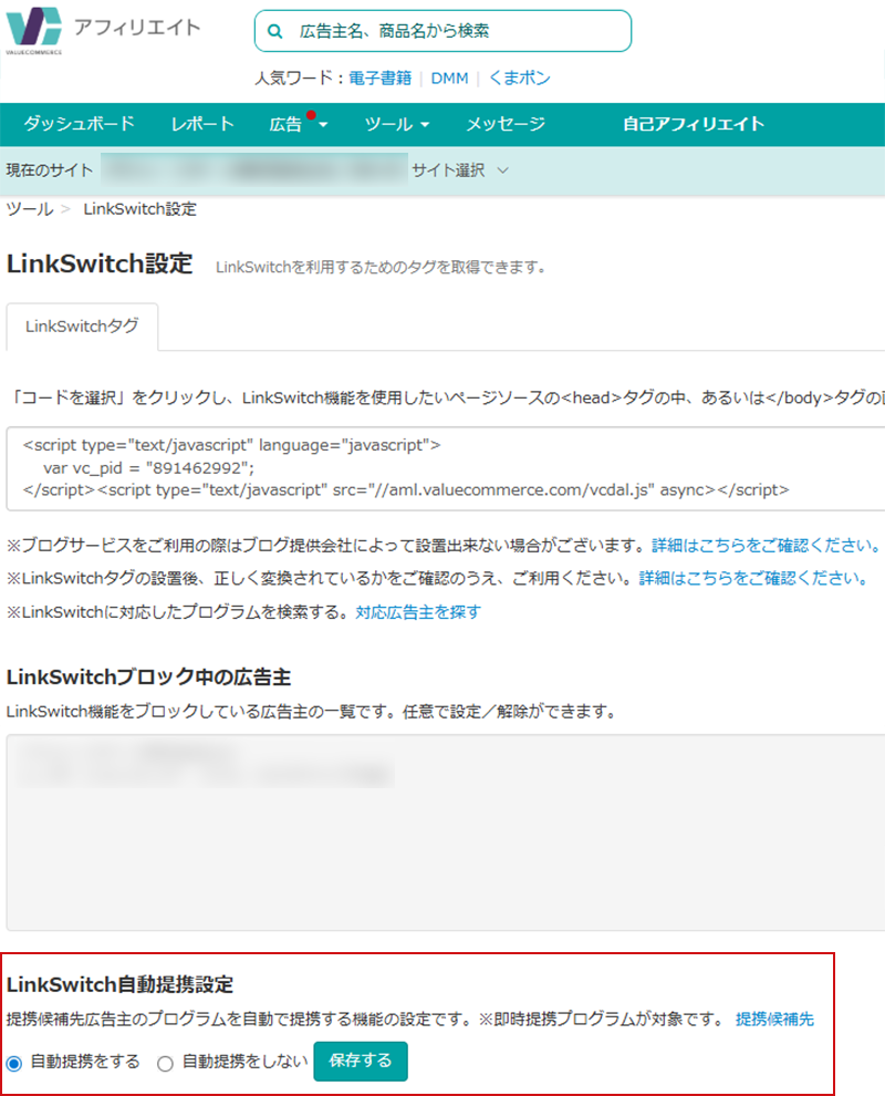・広告主単位で自動提携機能の有効/無効の設定を行いたい場合は、利用開始後に表示される管理画面内「ツール>LinkSwitch>ブロック設定」より設定をお願いします(詳細は後述)。