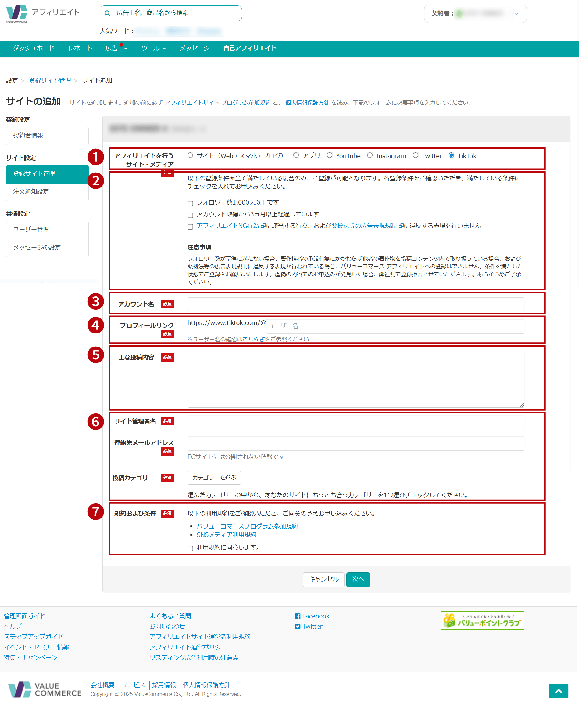 初めてYouTubeやInstagram、X(旧Twitter)、TikTokへ広告掲載を行うためには、まず利用するアカウントのバリューコマース アフィリエイトのサイト登録が必要になります。以下リンクよりサイト登録・サイト追加を行ってください。