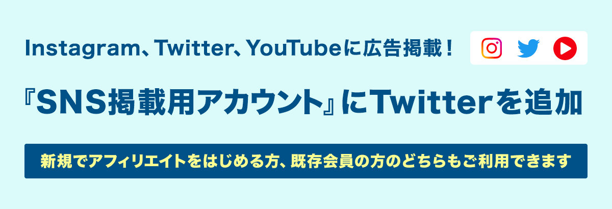 これまでのYouTubeとInstagramに加え、新たにTwitterにもアフィリエイト広告の掲載が可能となるため、収益拡大に向けた活動をさらに広げることができます。