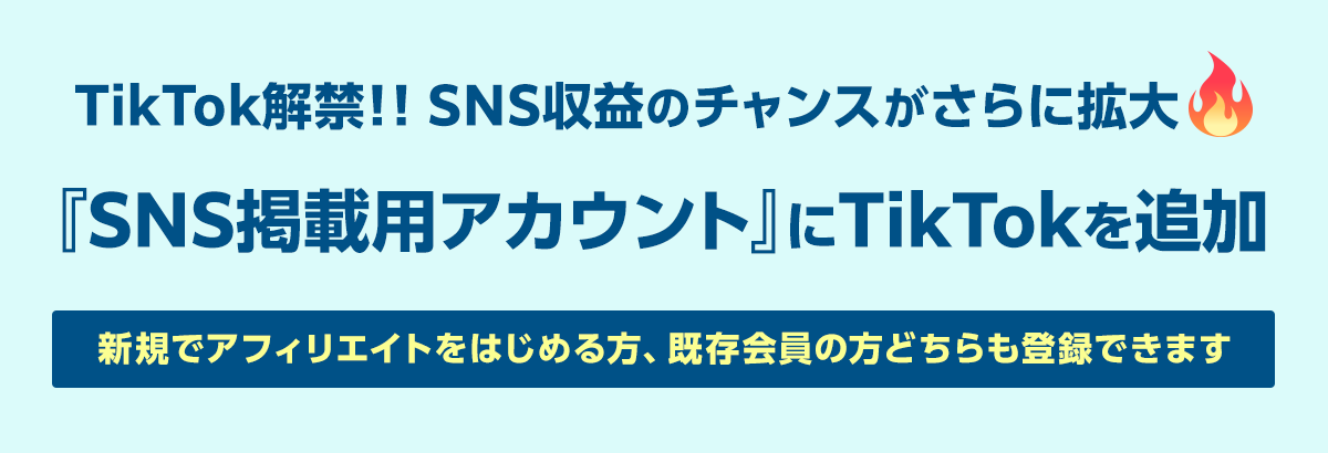 ご自身のTikTokアカウントを『SNS掲載用アカウント』として登録することで、TikTokでもアフィリエイトができるようになります。