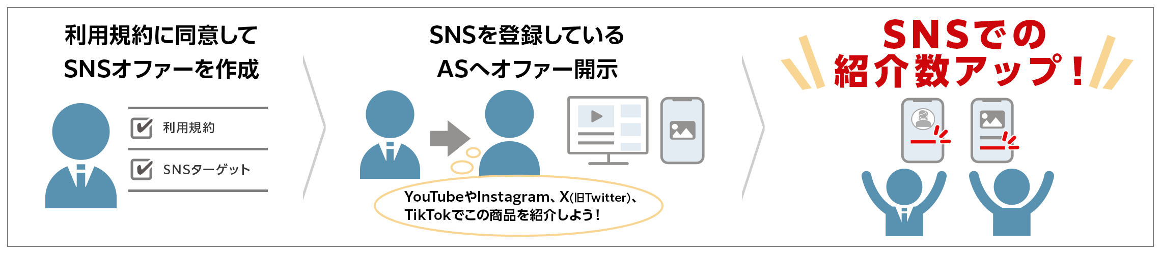 SNSオファーとは、SNSメディア(YouTube、Instagram、X(旧Twitter)、TikTok)を登録しているアフィリエイトサイトへ向けてオファー(報酬条件)を開示できる機能です。